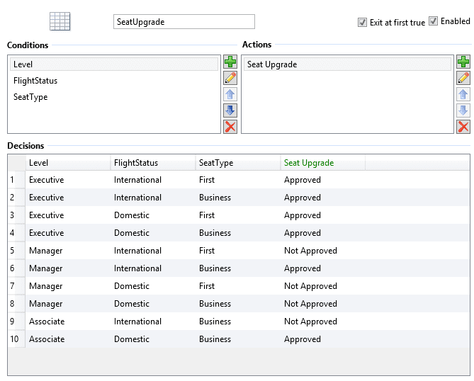 - Decision table editor – streamlines large sets of related business rules in a multi-dimensional matrix by combining multiple conditions and actions