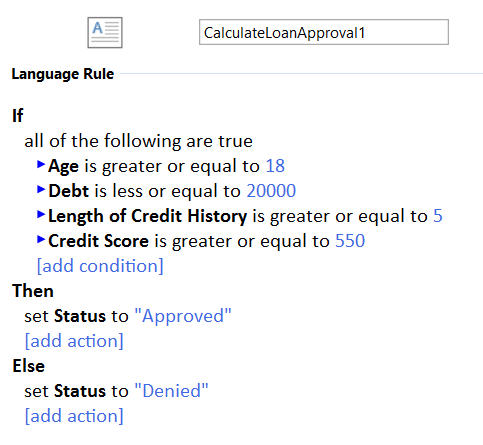 The loan officer uses a couple of fields like age, debt total, length of credit history, and credit score for the rule. Using these fields, the loan officer creates a rule app that says if the loan applicant’s age is greater than or equal to 18 years old, their debt is less than or equal to $20,000, their length of credit history is 5 years or more, and their credit score is greater or equal to 550, then they will be approved for the loan. Below is what this rule looks like: