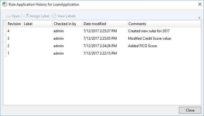 Now let’s look at where these rules will live when they are not in use and where the loan officer can track the history of their changes. Below, you can see them sitting in irCatalog, our storage component. From here, our loan officer can check the rules in and out and monitor the latest changes made to these rules. This will help provide consistency and transparency for the organization.