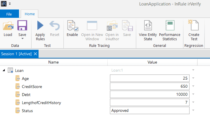 Now the loan officer needs to test the rule app to make sure it works. Using irVerify, the loan officer can test this rule app by entering in a few data points for these fields. For age, the loan officer enters 25, credit score is 650, debt comes in at $10,000, and length of credit history is seven years. When the loan officer applies the rules and tests them, the status comes back as “Approved” – this rule app works!