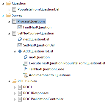 As a side note, the name of the survey is POC1, so I’ve named rules that pertain to this specific survey accordingly. That gives us a nice separation between infrastructure and survey-specific logic. Each action in this ruleset defines the end-state of answering a question or questions: