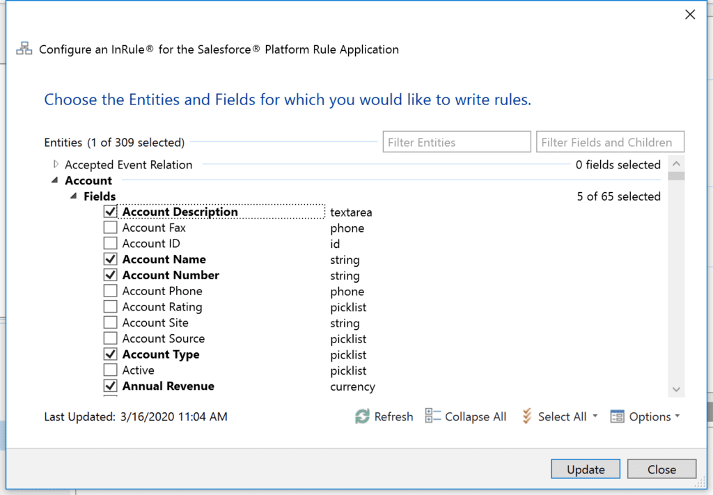 Just like when creating any other Rule Application, the first step is to define the entity schema for the Application. When running in the context of Salesforce, this is simple – simply connect irAuthor to your instance of Salesforce using irX for Salesforce and choose the items that you plan to use in your rule application! All the entities, relationships, selected fields, and relationship structure will be imported and populated in your Application, giving you a and fast and easy path to starting off your integration journey. The irX for Salesforce ribbon also gives you access to all the other functionalities you might need when interacting with Salesforce like testing and configuration in one simple place.