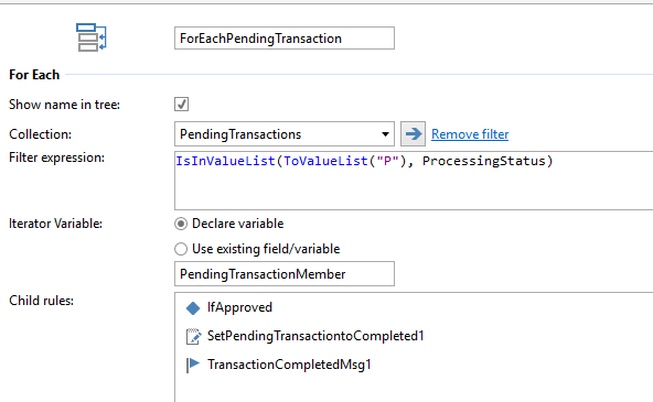 However, with the For Each loop, I could easily apply a filter at the loop level. In this case, InRule won’t iterate through the members that don’t match the filter.