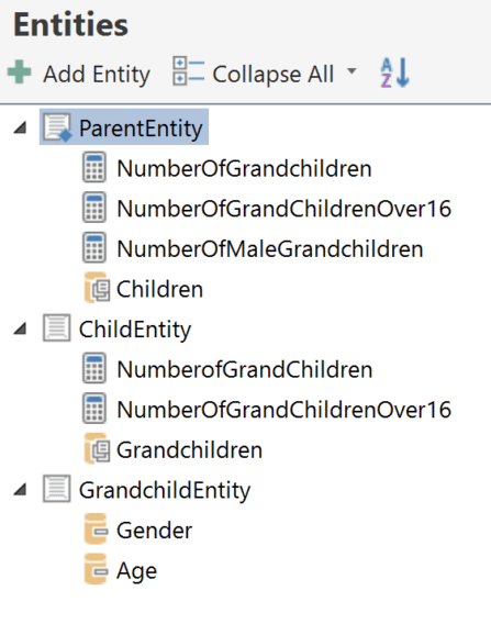 The first step in our design is to set up three entities: ParentyEntity, ChildEntity, and GrandchildEntity. Then under the ParentEntity, add a collection of ChildEntity called Children.