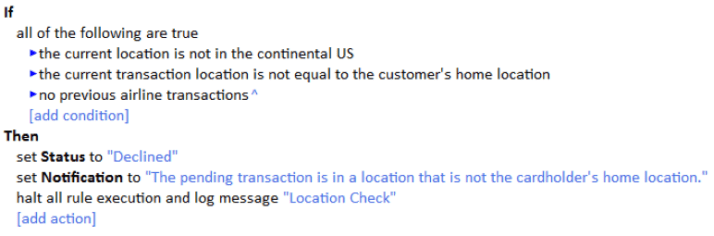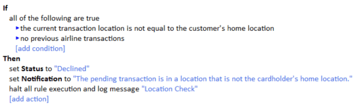 Scenarios like this may be legitimate, but what if I, as the consumer, want to be the one who adjusts the parameters that trigger a fraud alert? Maybe I’m going on a family vacation and I know there are going to be some hefty transactions north of the $500 line. If this application was self-service, I could tweak that rule so that I wouldn’t get notified or my card wouldn’t get deactivated while I’m on that vacation. And speaking of travel, we could even create rules to account for something like the following: