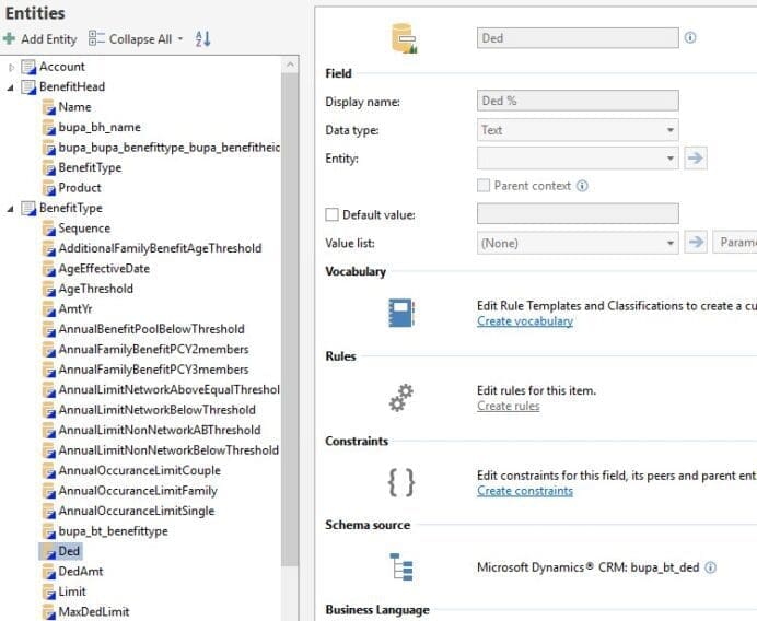 Once I’ve added enough to get started, I click Finish and can see the entity structures I’ve imported. Note that I can see the Dynamics name for the entity in the Schema Source section of a selected entity or field: