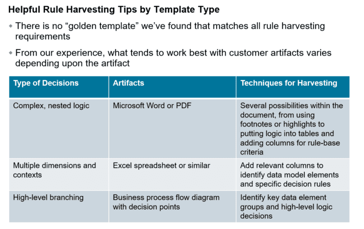 Once you’ve determined that you wish to use a rule engine (or any other software) to execute your logic, you need to find a way to turn your existing rule artifacts into rules logic. If your business rules project revolves around data that is not currently being captured (some of our customers have started new projects this way), then you will need to consider how to capture it.