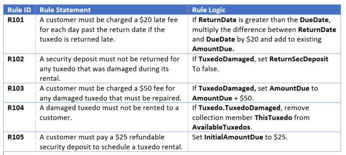 The table below represents rules that a business analyst has identified and tagged. But what else needs to be done with these rules to get them ready for a rule application? How can these rules be translated into action?